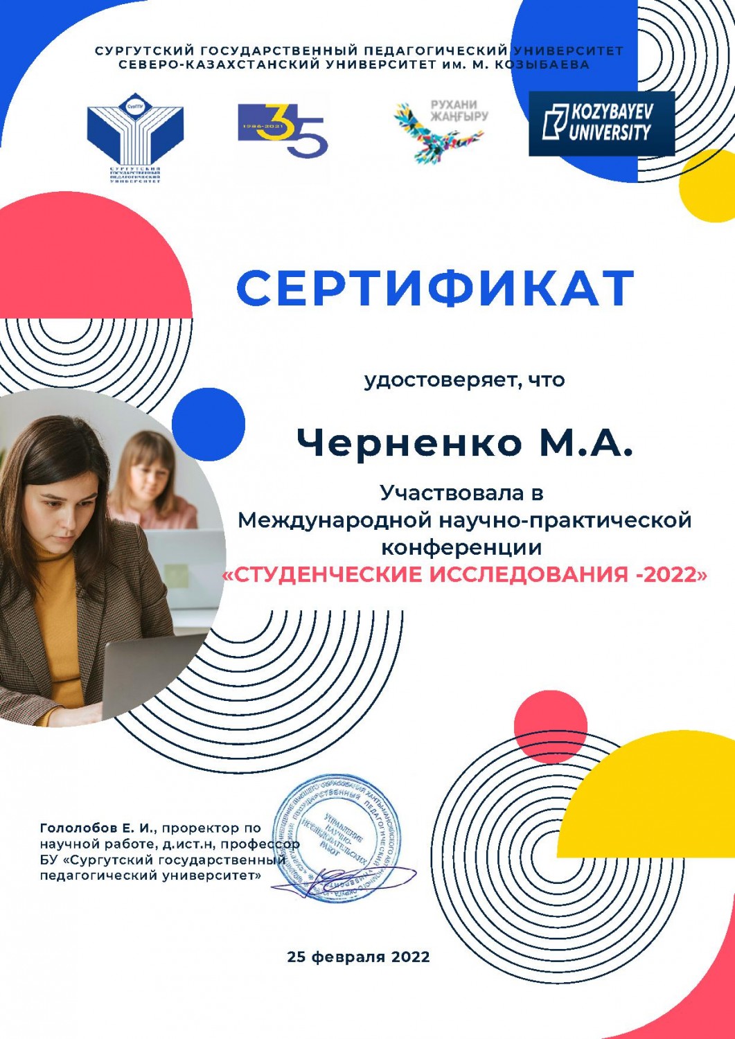 | 20 | Международная научно - практическая конференция | «Студенческие исследования - 2022» | 2022 | Сертификат |