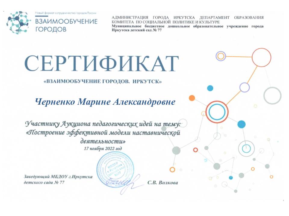 | 22 | Аукцион педагогических идей | «Построение эффективной модели наставнической деятельности» | 2022 | Сертификат |