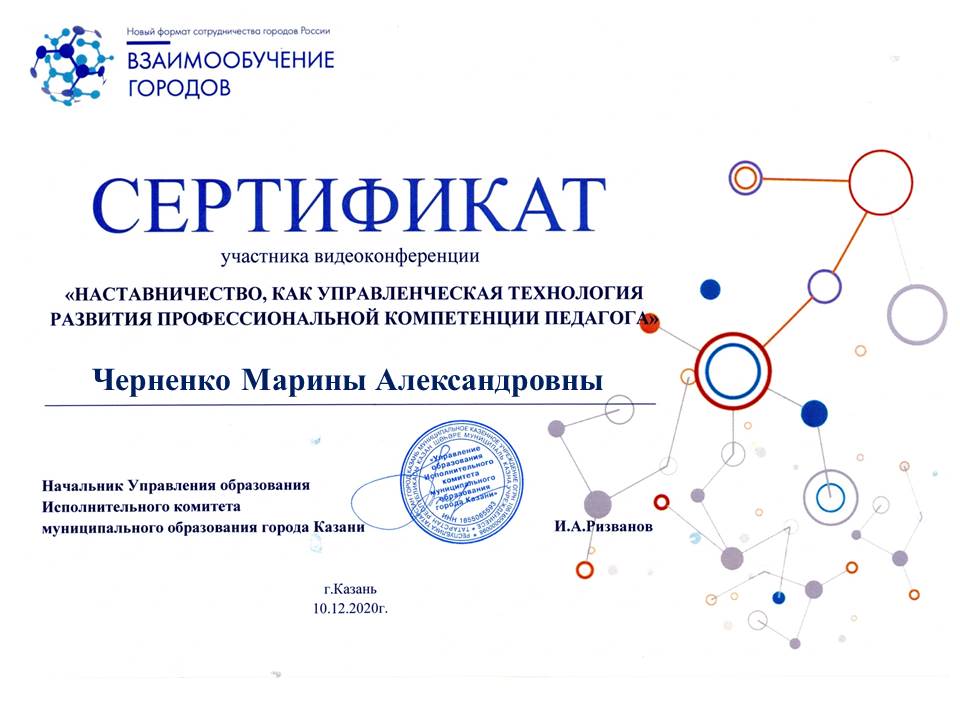 | 29 | Видеоконференция | «Наставничество, как управленческая технология развития профессиональной компетенции педагога» | 2020 | Сертификат |