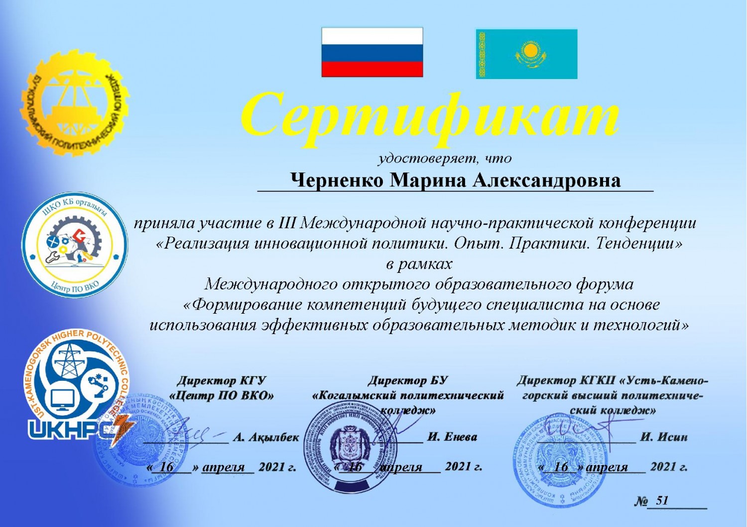 | 25 | Международная научно - практическая конференция | «Формирование компетенций будущего специалиста на основе использования эффективных образовательных методик и технологий» | 2021 | Сертификат |