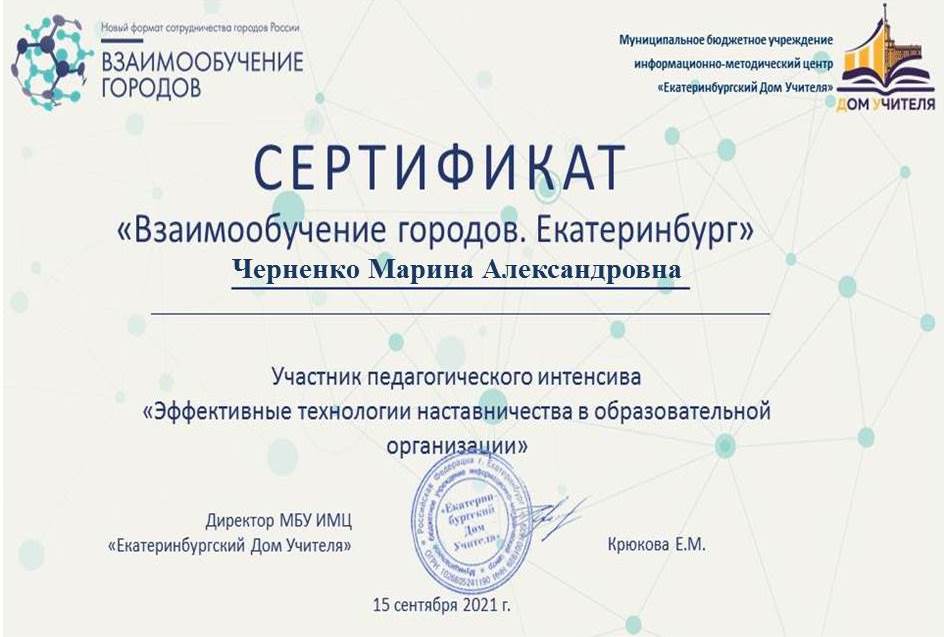 | 24 | Педагогический интенсив | «Эффективные технологии наставничества в образовательной организации» | 2021 | Сертификат |