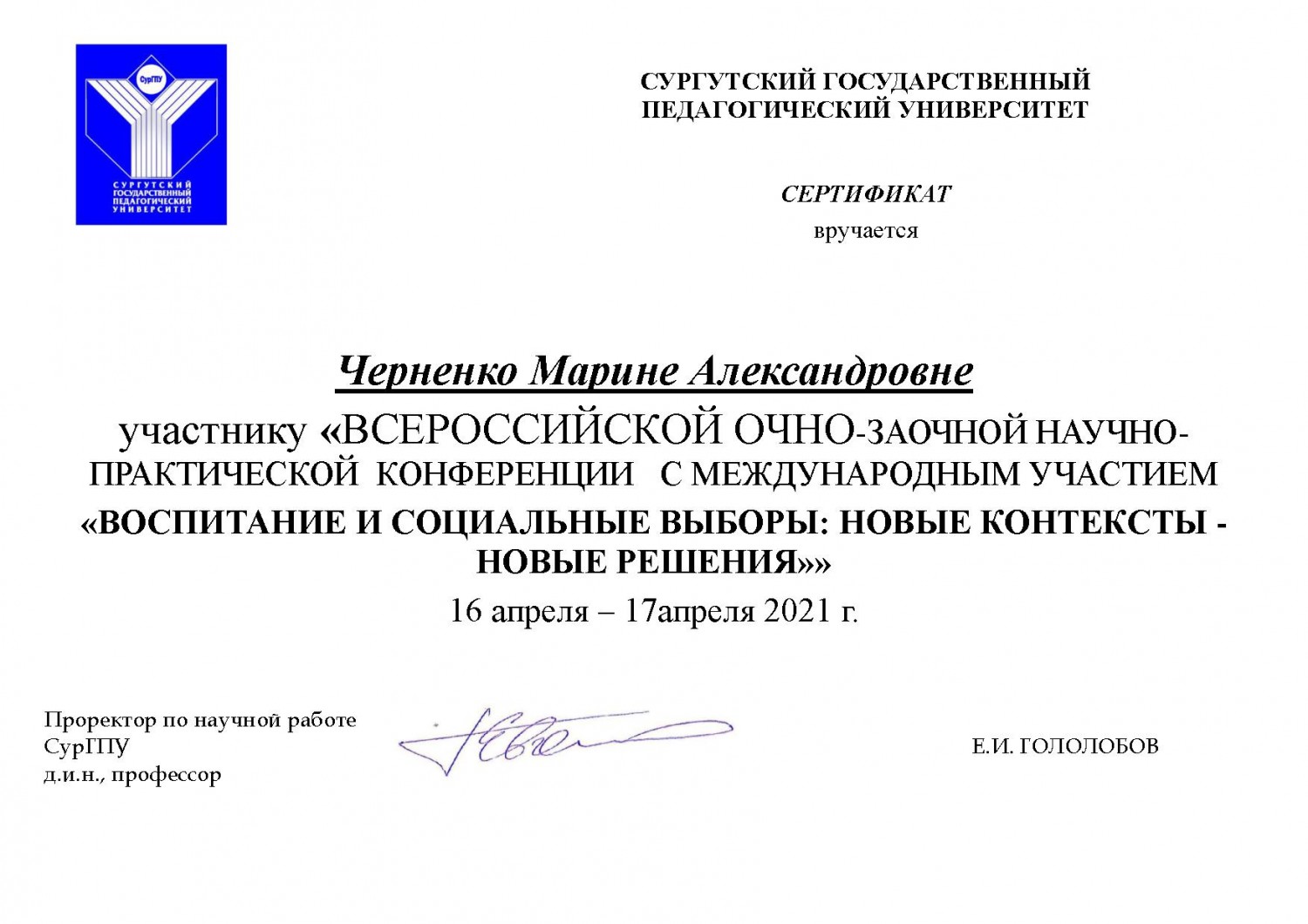 | 26 | Всероссийская научно - практическая конференция | «Воспитание и социальные выборы: новые контексты - новые решения» | 2021 | Сертификат |