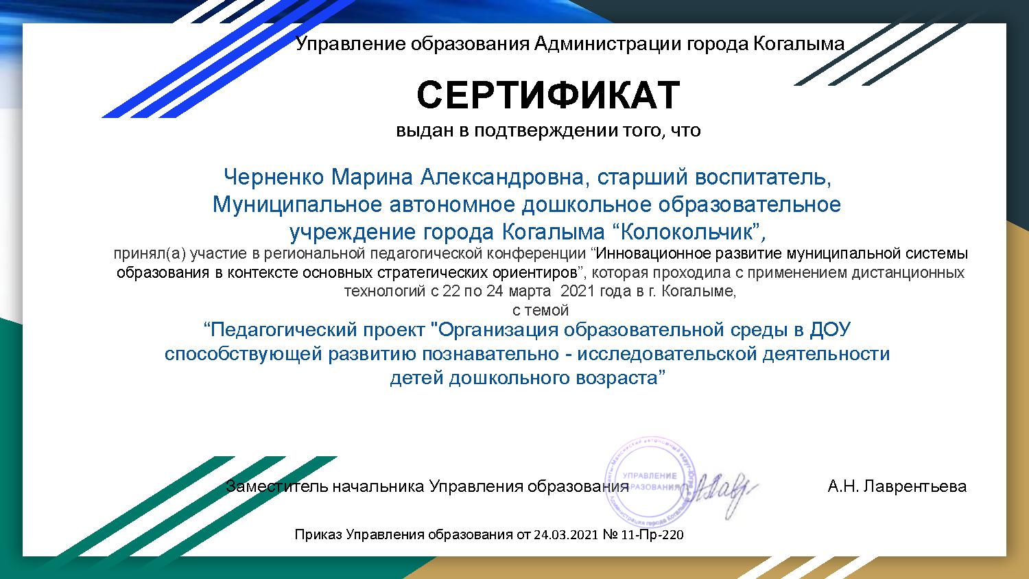 | 27 | Региональная педагогическая конференция | «Инновационное развитие муниципальной системы образования в контексте основных стратегических ориентиров» | 2021 | Сертификат |
