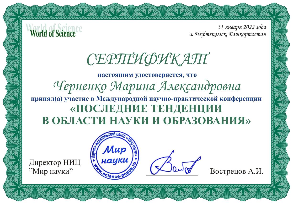 | 21 | Международная научно - практическая конференция | «Последние тенденции в области науки и образования» | 2022 | Сертификат |