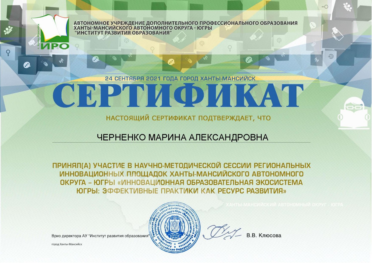| 23 | Региональная научно - методическая сессия | «Инновационная образовательная экосистема Югры: эффективные практики как ресурс развития» | 2021 | Сертификат |