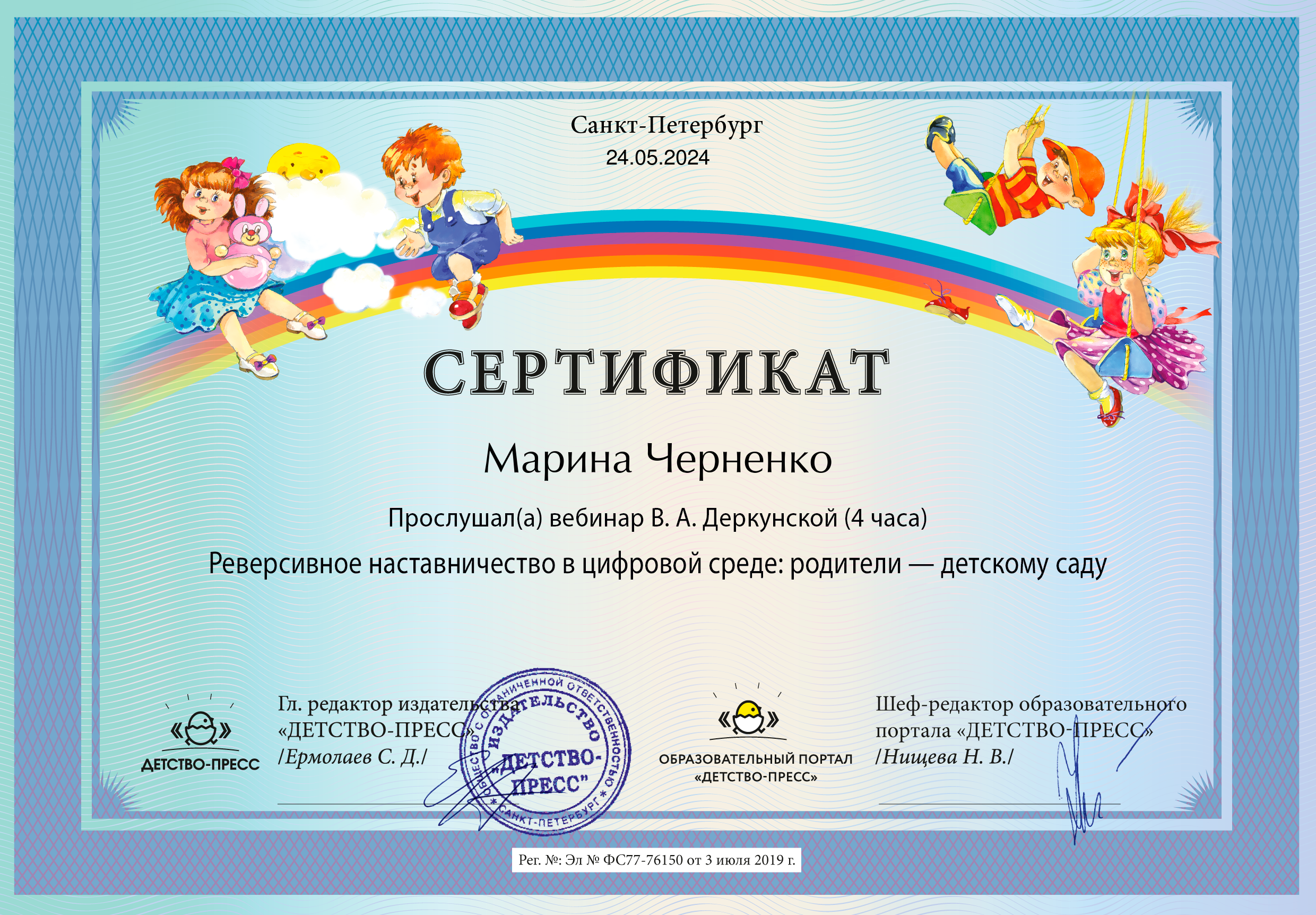 | 3 | Вебинар | «Реверсивное наставничество в цифровой среде: родители - детскому саду » | 2024 | Сертификат |