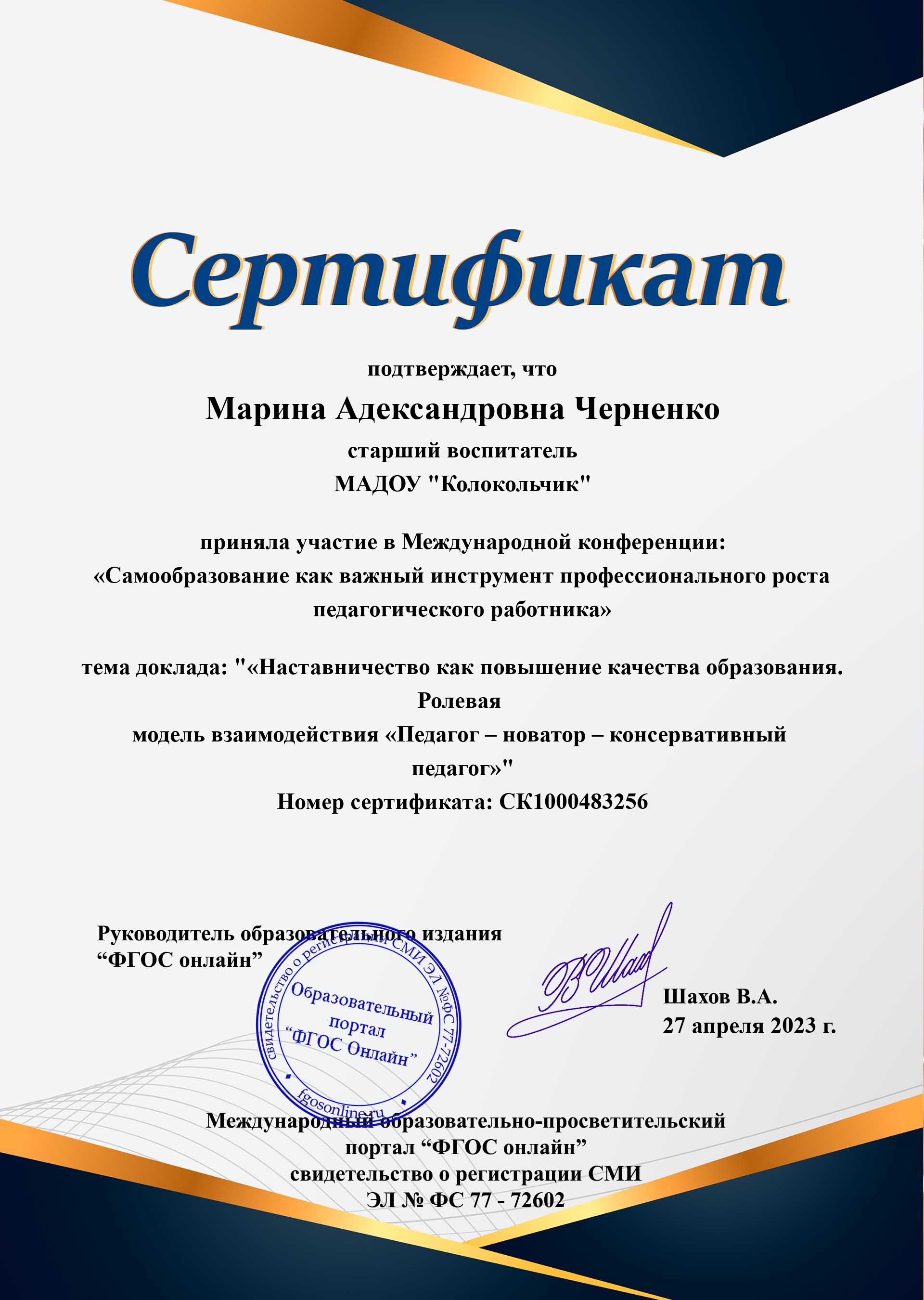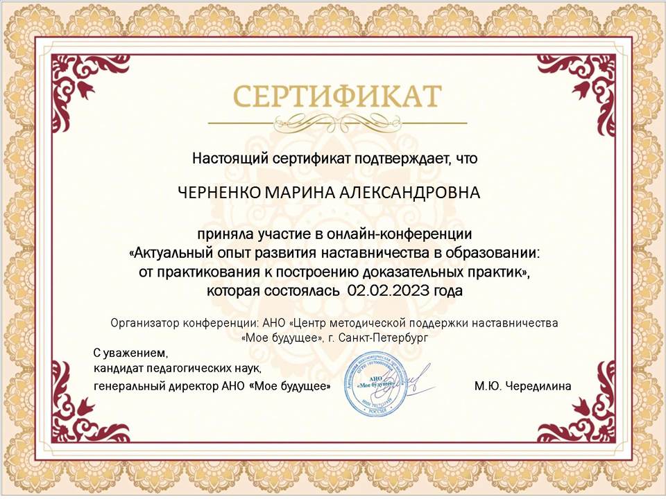 | 7 | Онлайн-конференция | «Актуальный опыт развития наставничества в образовании: от практикования к построению доказательных практик» | 2023 | Сертификат |