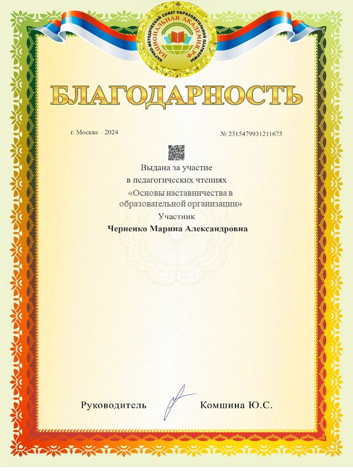 | 5 | Педагогические чтения | «Основы наставничества в образовательной организации» | 2024 | Сертификат |