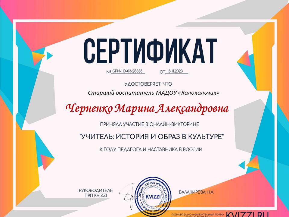 | 10 | Онлайн-викторина | «Учитель: история и образ в культуре», к году педагога и наставника в России» | 2023 | Сертификат |