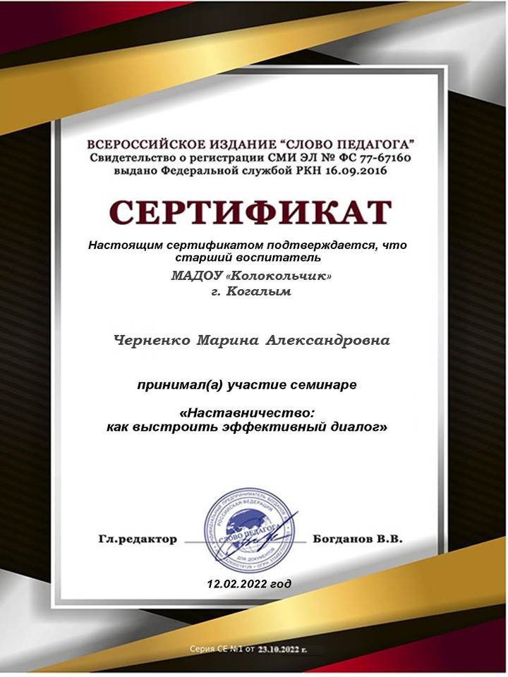 | 15 | Семинар | «Наставничество: как выстроить эффективный диалог» | 2022 | Сертификат |