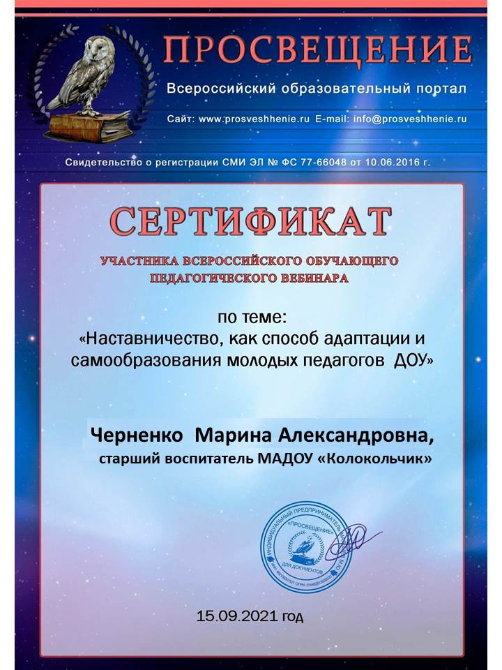 | 28 | Всероссийский обучающий вебинар | «Наставничество, как способ адаптации и самообразования молодых педагогов» | 2021 | Сертификат |