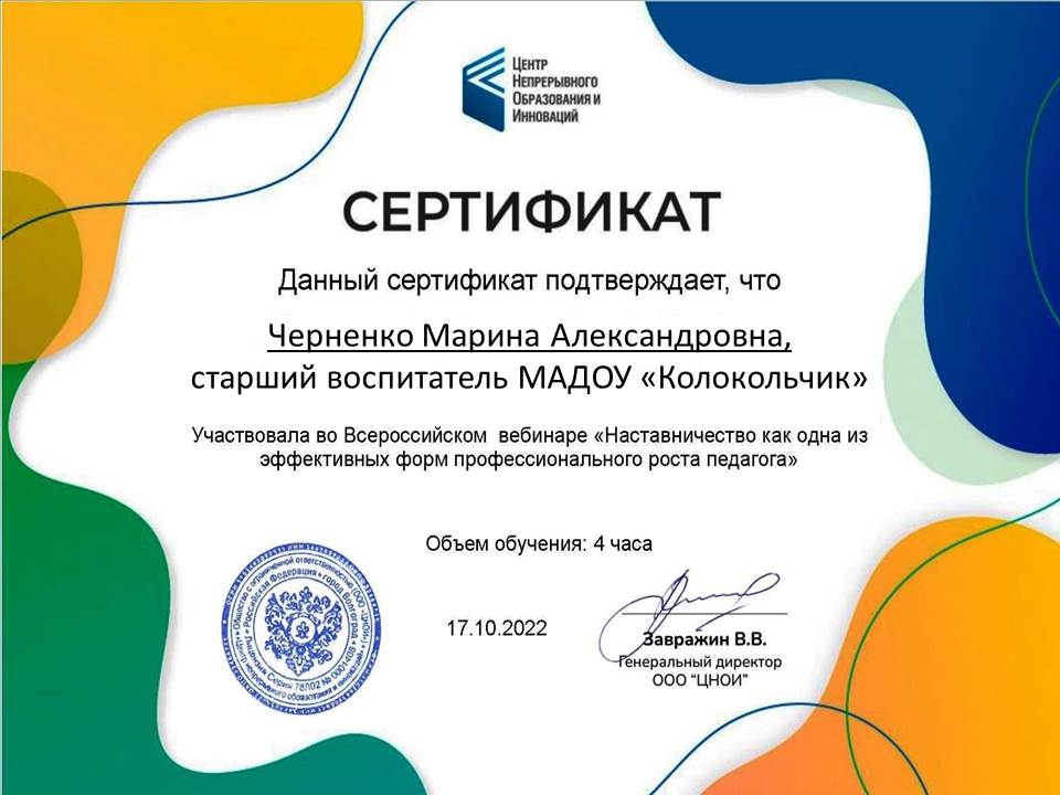 | 14 | Всероссийский вебинар | «Наставничество как одна из эффективных форм профессионального роста педагога» | 2022 | Сертификат |