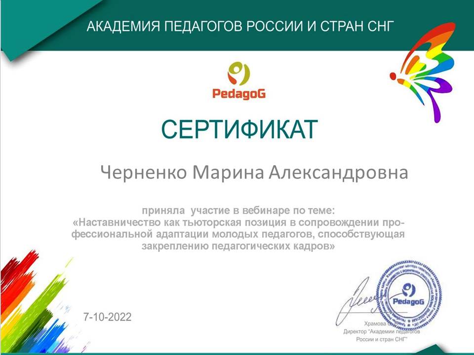 | 16 | Вебинар | «Наставничество как тьюторская позиция в сопровождении профессиональной адаптации молодых педагогов, способствующая закреплению педагогических кадров» | 2022 | Сертификат |