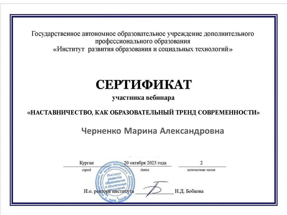 | 12 | Вебинар | «Наставничество, как образовательный тренд современности» | 2023 | Сертификат |