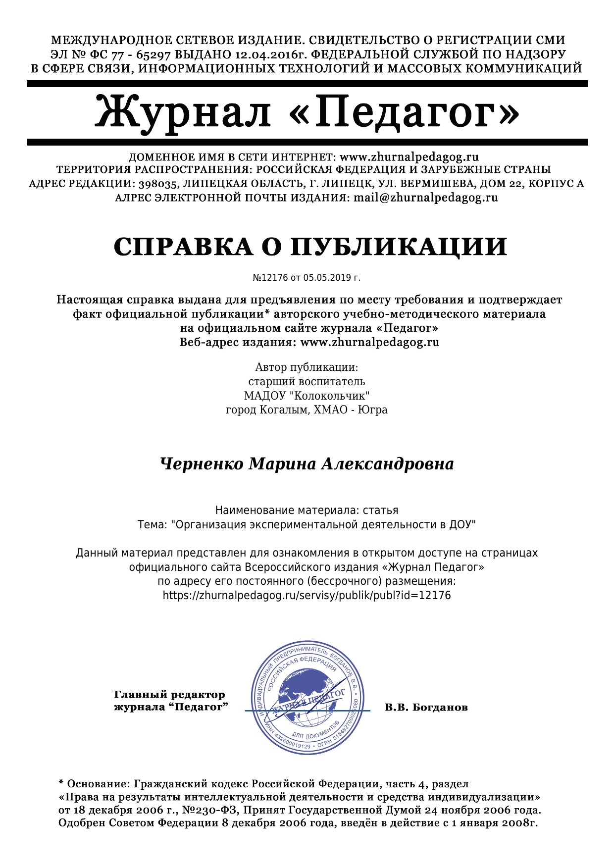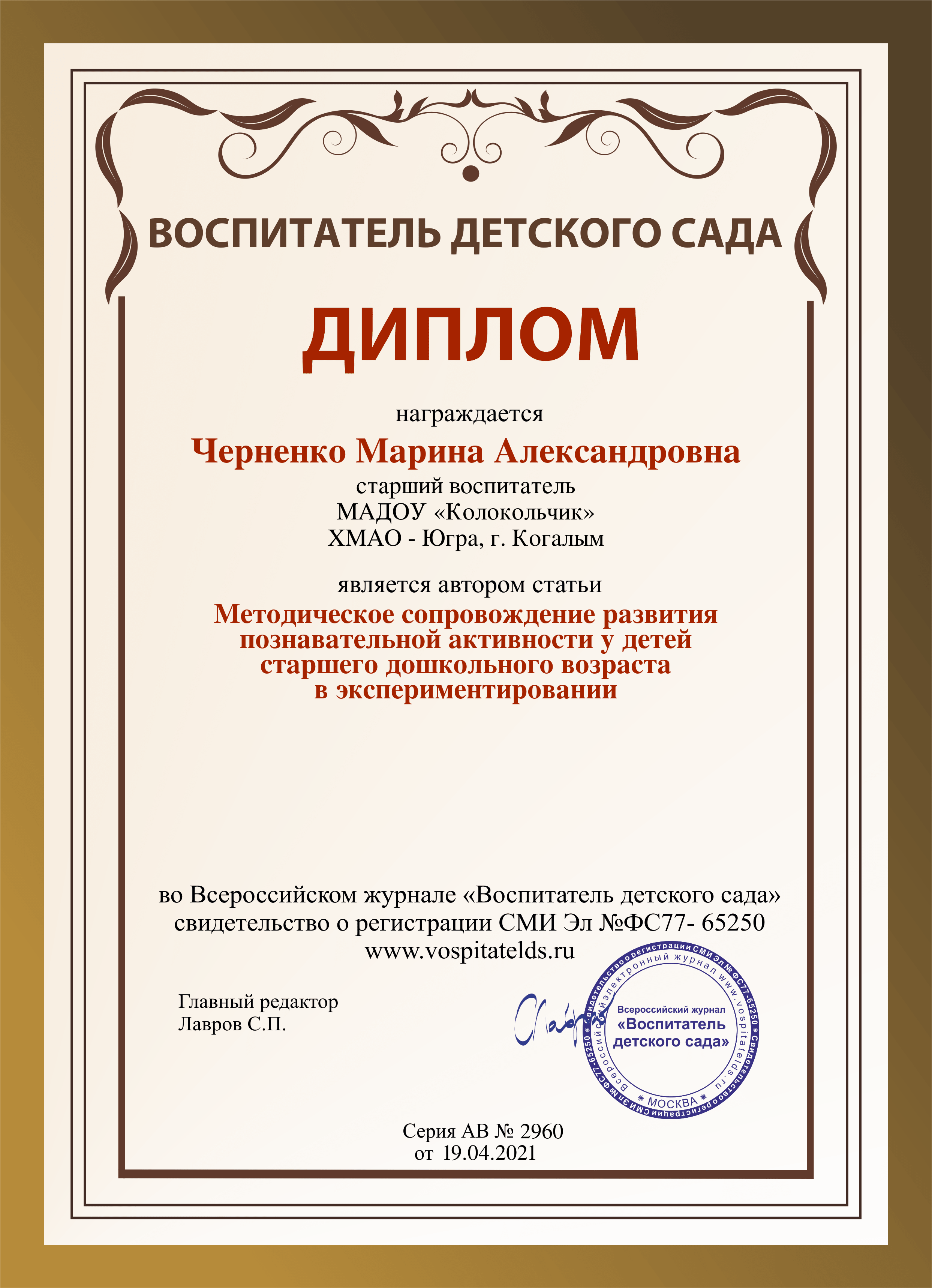 "Воспитатель детского сада" Всероссийский журнал