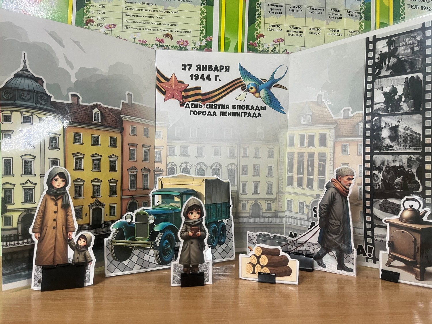 В честь этой памятной даты в дошкольных группах прошли мероприятия, посвященные Дню снятия блокады Ленинграда. Воспитатели, используя видеопрезентации, картинки из кадров кинохроники, рассказали воспитанникам о исторических событиях Блокадного Ленинграда, о том, что жители осажденного города не сдались врагу и выдержали без продовольствия, электричества и тепла почти 900 дней. Ребята узнали о судьбе девочки Тани Савичевой. Дошкольники и педагоги почтили память погибших минутой молчания. Все это произвело на детей неизгладимое впечатление, каждый ребенок почувствовал волнение и трепет о той информации, которую узнал в этот день.